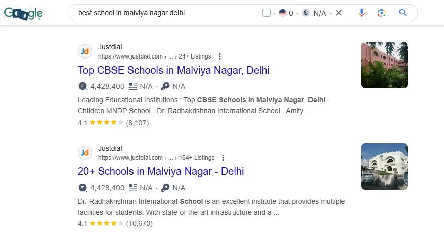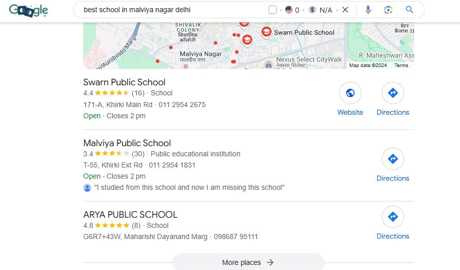 Here’s how it works: When a parent searches for schools or educational services in their area—using terms like “CBSE schools near me,” “best senior secondary schools,” or “best play school in Malviya Nagar”—Google uses the information in your GBP profile to determine whether your school matches the query and whether the person searching is located near your school. If your Google Business Profile is well-optimized and contains all the necessary details, Google will showcase your school in the local search results. Additionally, if the search is made on Google Maps, your school will appear there as well.